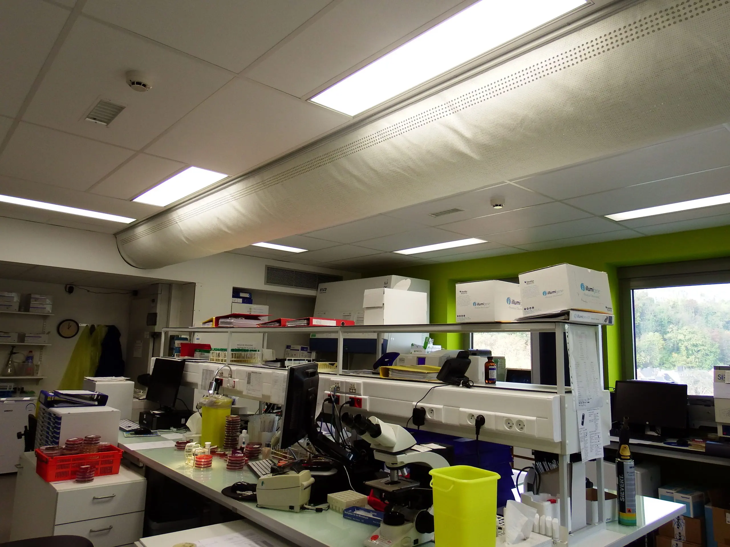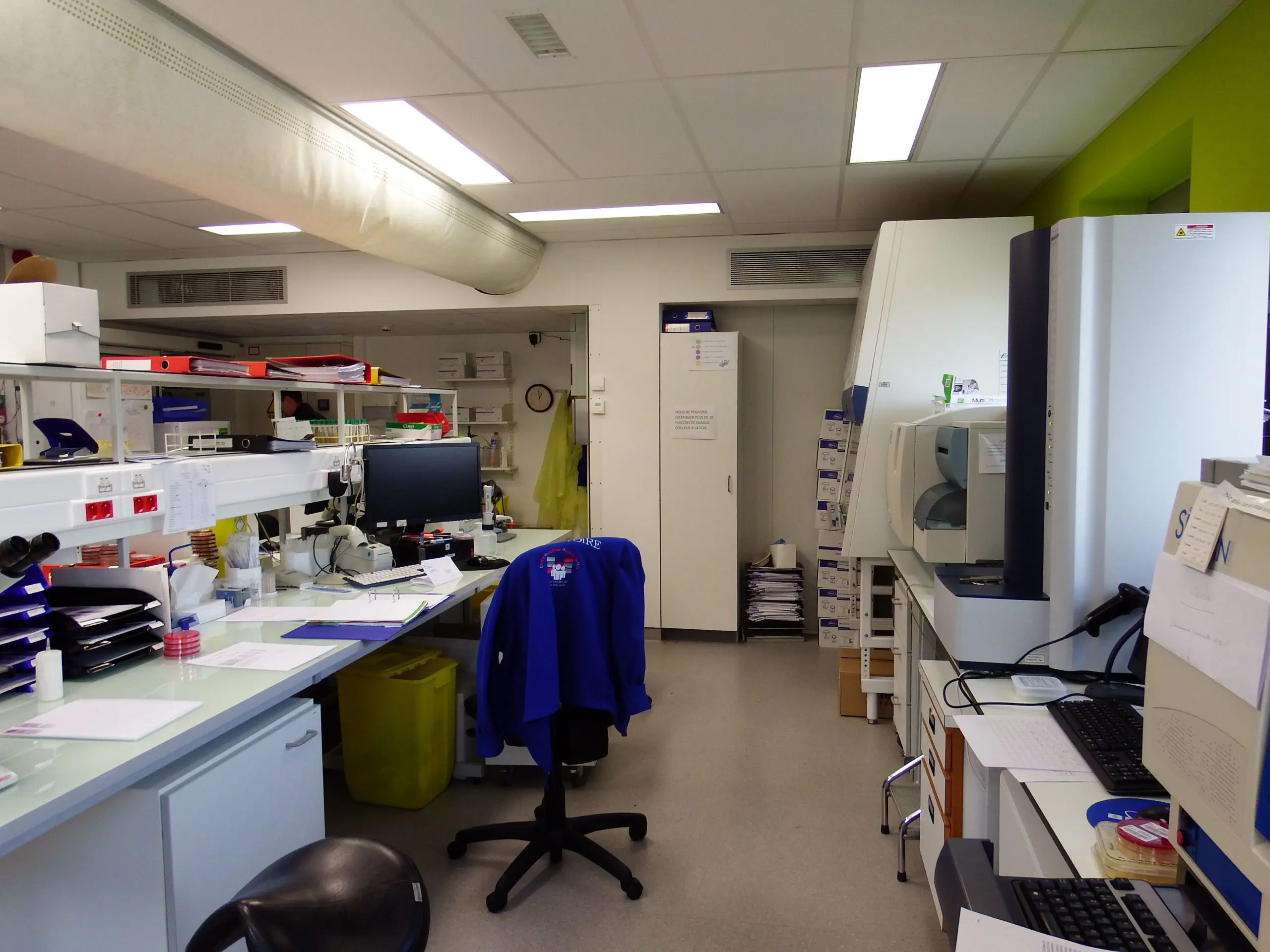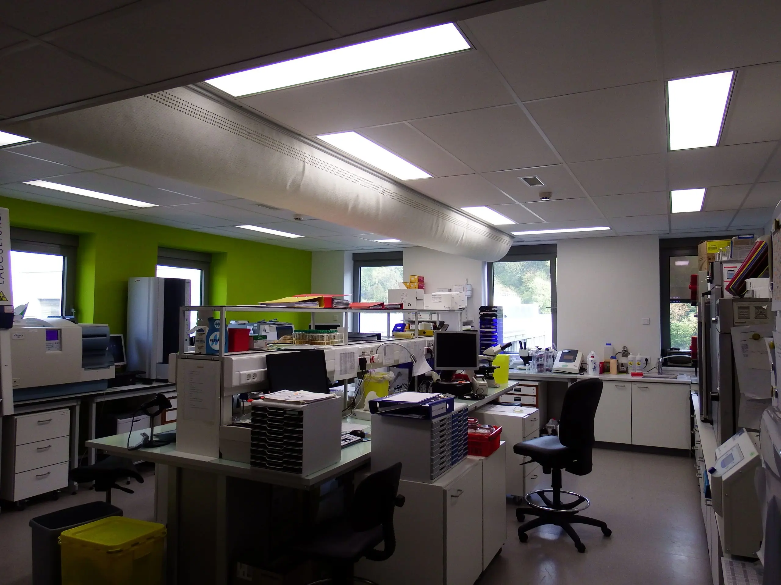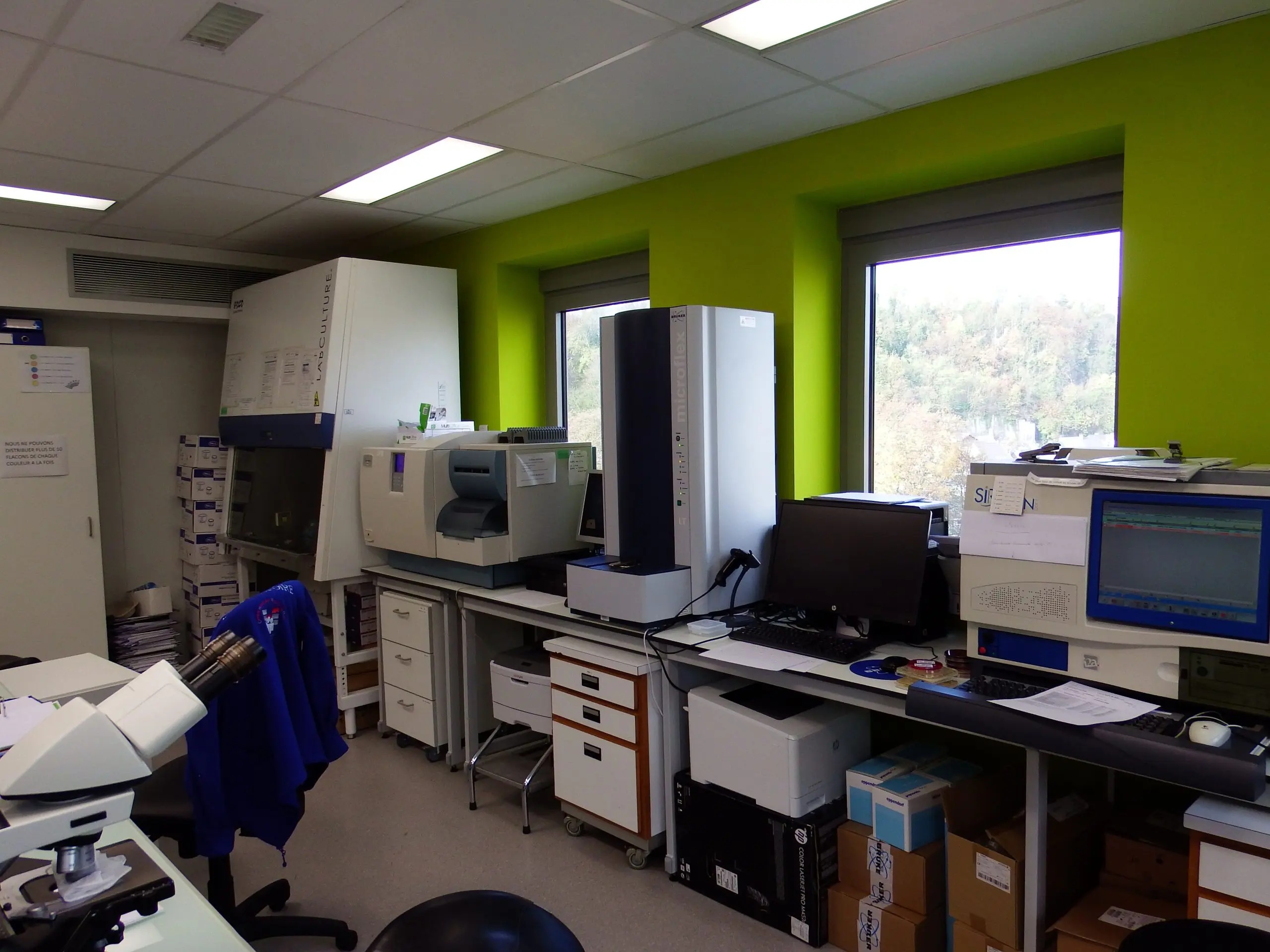 Réorganisation complète des laboratoires d’analyses médicales et de bactériologie de l’hôpital; réalisation en trois phases, avec maintien de l’activité et implantation d’un laboratoire provisoire.
